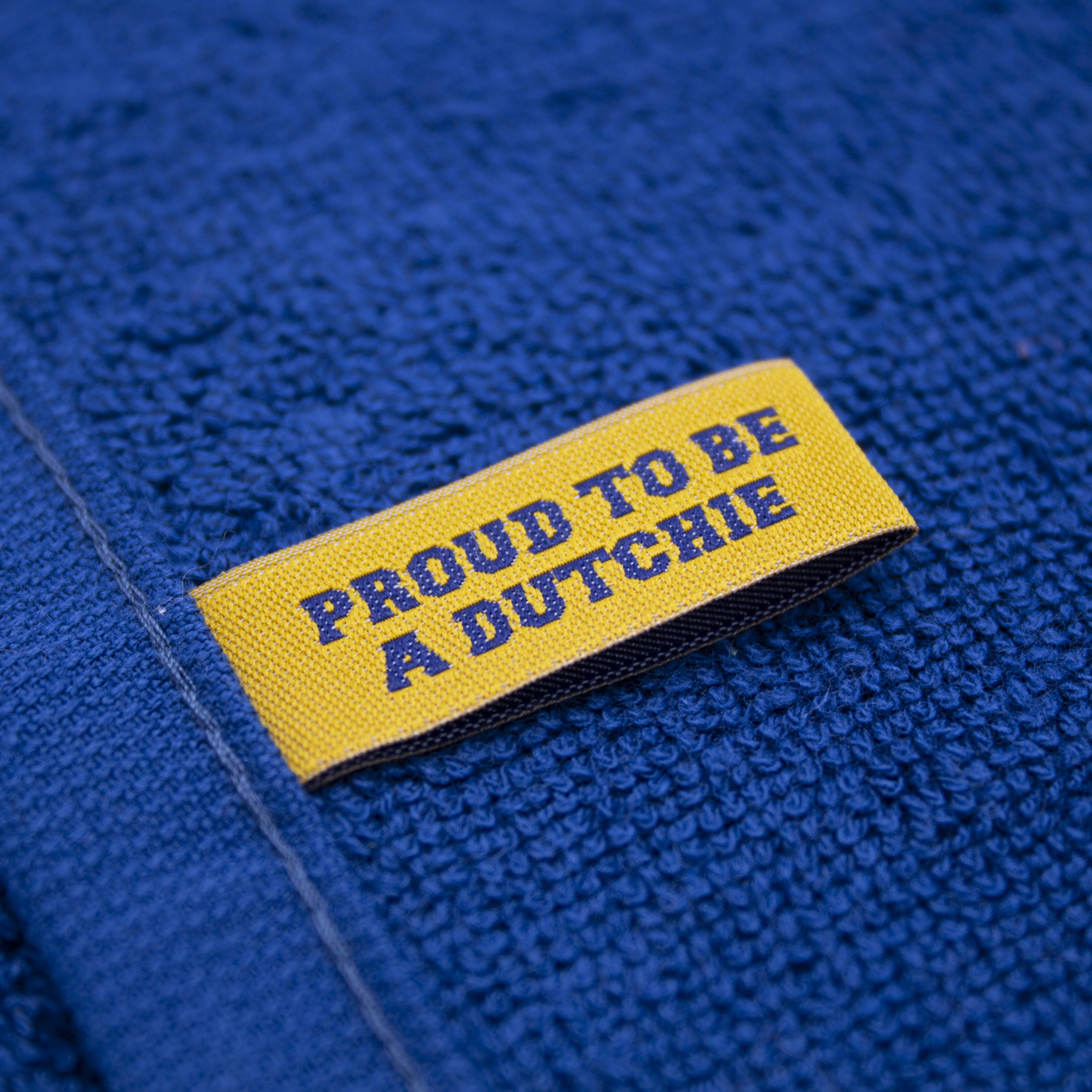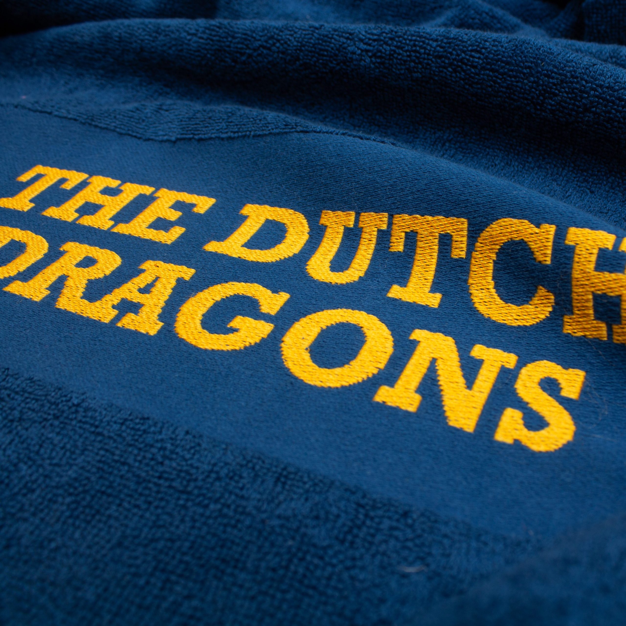 Gave handdoek met het Dutch Dragons logo als ingeweven reliëf. Daarnaast een waslabel met de bedrukking: Proud to be a Dutchie